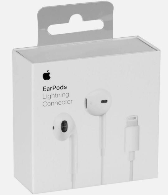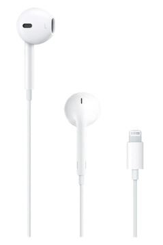 Apple EarPods with Lightning Connector are wired earbuds featuring a geometric, ergonomic design for comfort, a built-in Lightning plug, and an inline remote with a microphone. They provide high-quality audio, deep bass, and work with iOS 10 or later on iPhones, iPads, and iPods, offering sweat/water resistance and volume control.