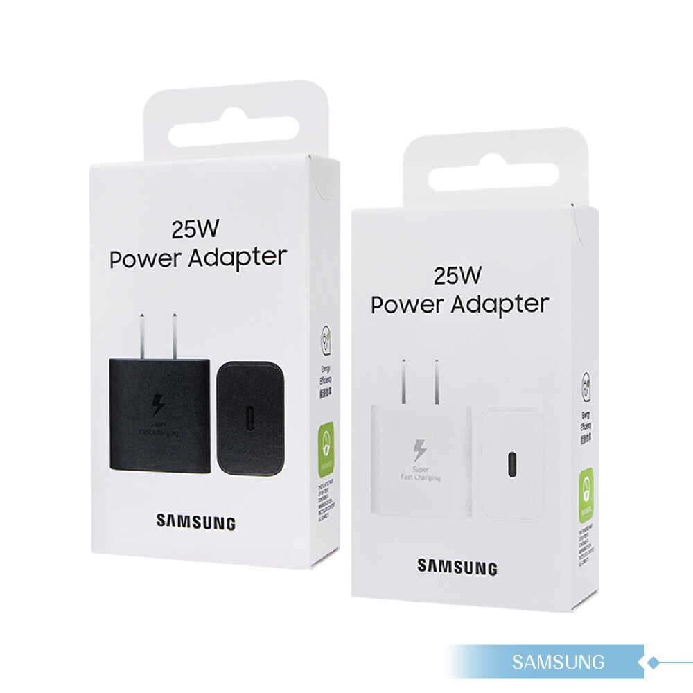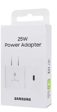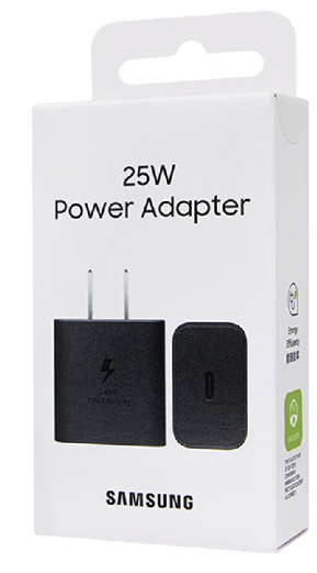 El Samsung 25W Power Adapter es el cargador estándar de carga rápida de Samsung, capaz de cargar dispositivos compatibles del 0% al 50% en aproximadamente 30 minutos. Utiliza la tecnología USB-C Power Delivery (PD) 3.0 con PPS (Fuente de alimentación programable) para optimizar la eficiencia y seguridad durante la carga