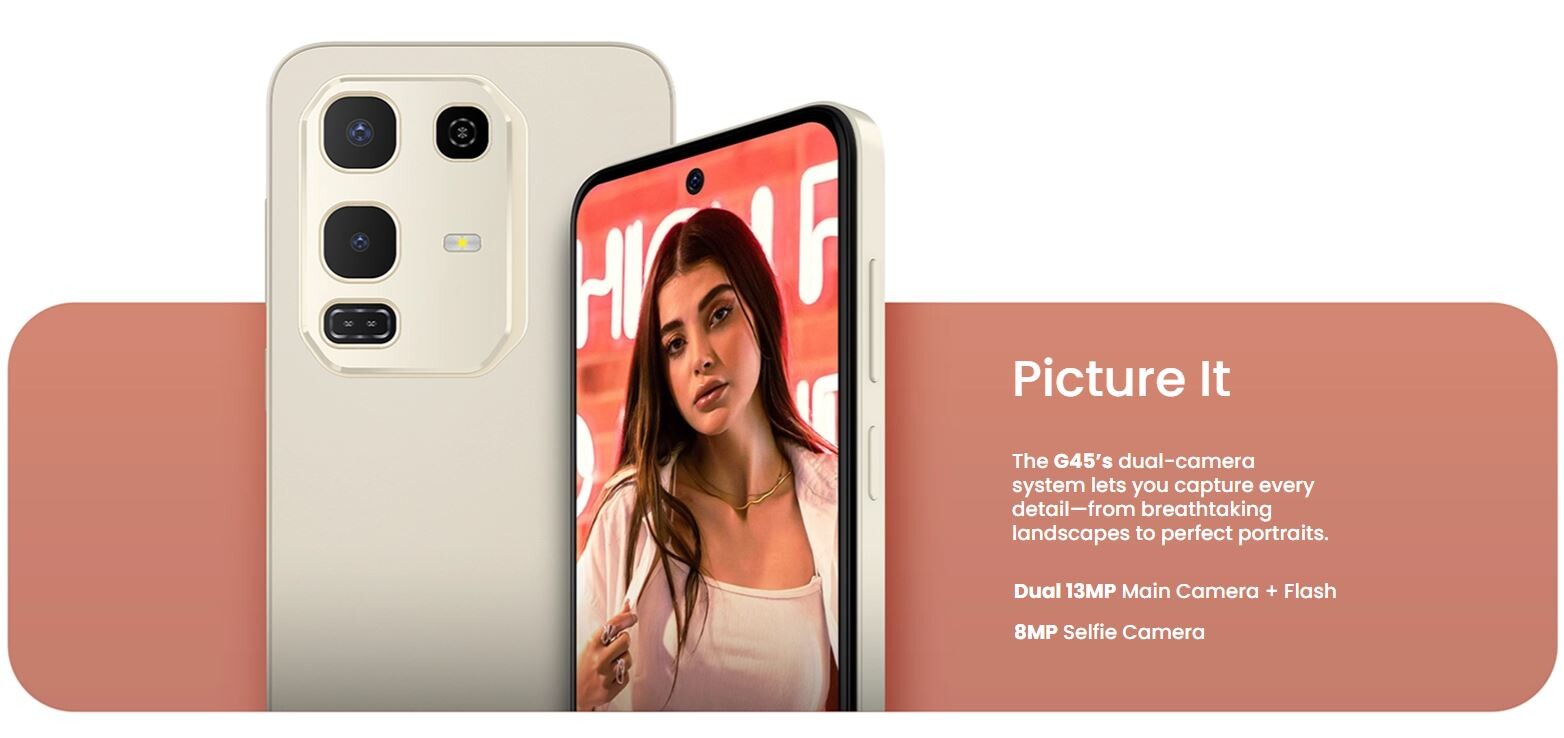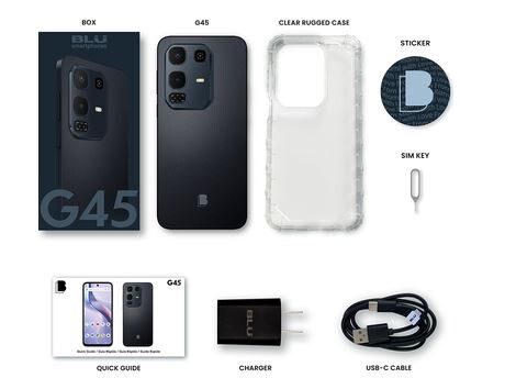 The BLU G45 is an budget-friendly unlocked smartphone featuring a 6.7-inch HD+ 120Hz Infinity display, 128GB of storage, and 4GB+8GB extended RAM, running Android 15. It boasts a 13MP main camera and a large 5,000mAh battery, designed for daily tasks with a modern, sleek finish. It is powered by an octa-core processor and includes a side-mounted fingerprint sensor.