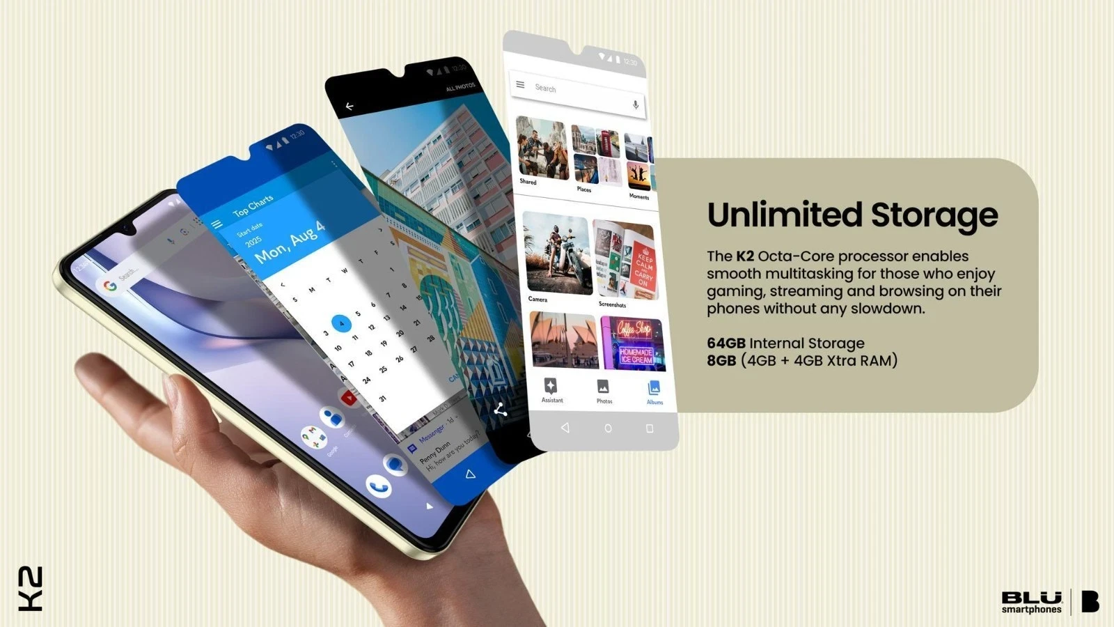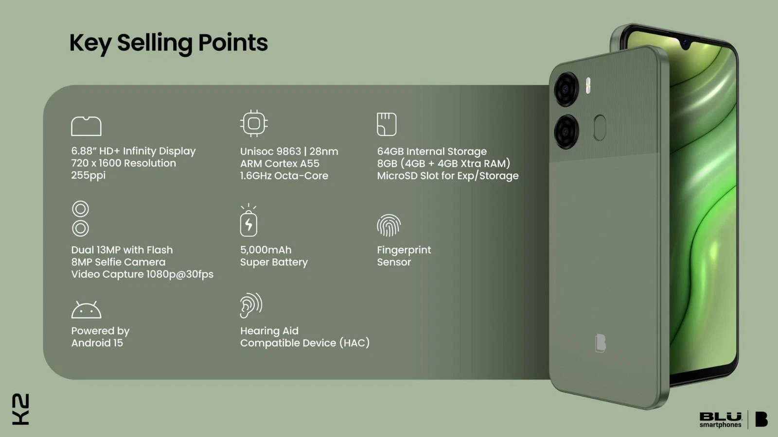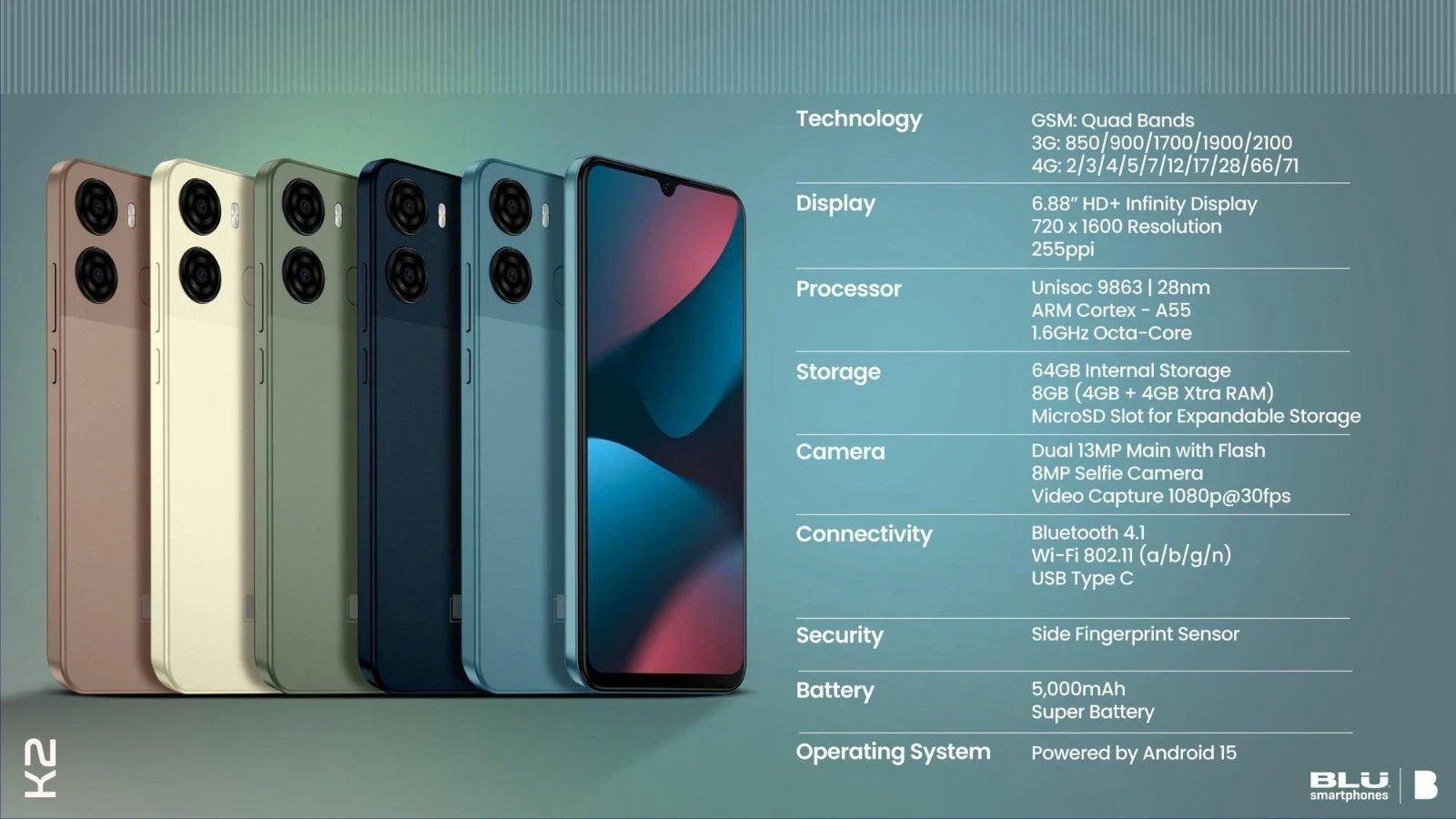 The BLU K2 is an budget-friendly, unlocked Android 15 smartphone released in early 2026, featuring a massive 6.88-inch HD+ display, 5,000mAh battery, and a 13MP dual camera system. It is designed for daily use, offering 64GB storage and an octa-core processor.