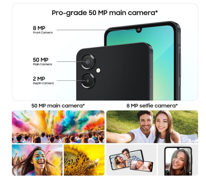 The Samsung Galaxy A06 is a budget-friendly 4G LTE smartphone (released Aug 2024) featuring a 6.7-inch HD+ display, a 50MP main camera, and a 5,000mAh battery with 25W charging. Powered by a MediaTek Helio G85 chipset with 4GB/6GB RAM and 64GB/128GB storage, it runs Android 14 with a focus on essential performance and long-lasting battery life.