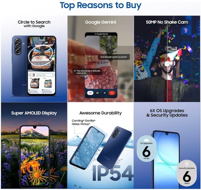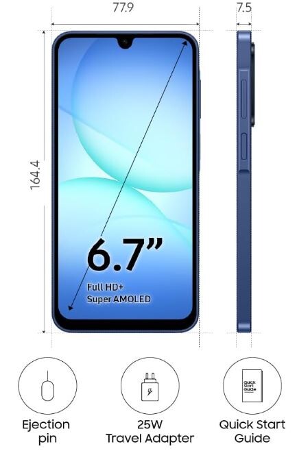 The Samsung Galaxy A17 5G (released August/August 2025) is an affordable 5G smartphone featuring a 6.7-inch 90Hz Super AMOLED display, Exynos 1330 processor, and a 5,000 mAh battery with 25W charging. It boasts a 50MP main camera with OIS, 6 years of security support, and runs Android 15, all in a slim 7.5mm plastic design.